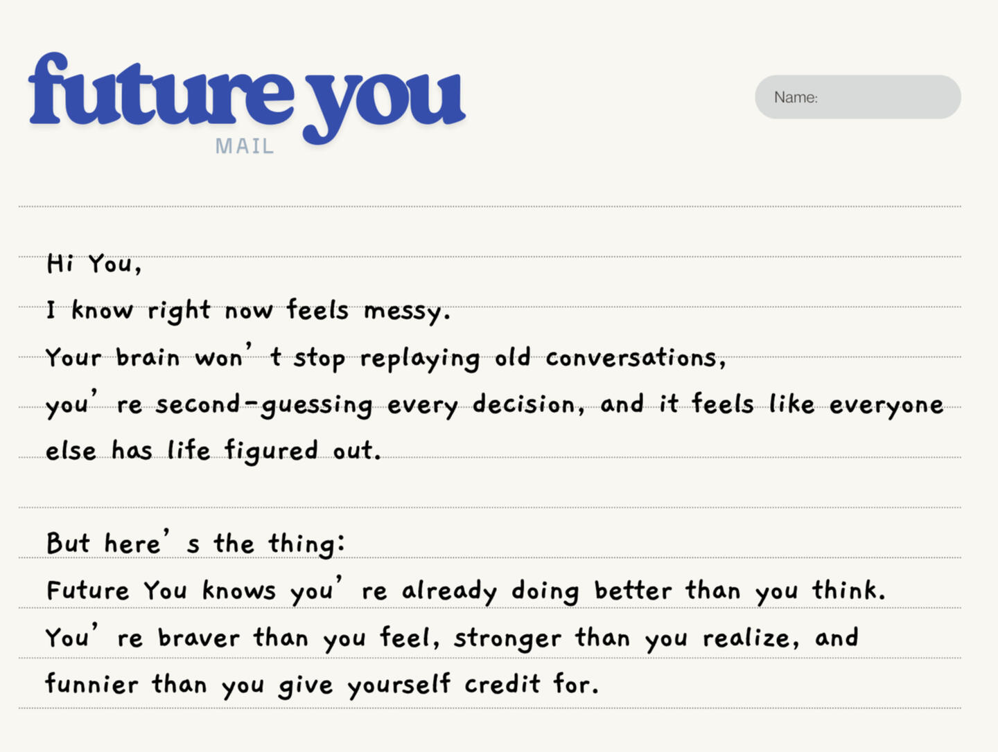 1๏ธโฃ Subscribe โ Hop on the waitlist for the Future You Mail Club and get early access.2๏ธโฃ Get Mail You Actually Want To Open โ Each month, a postcard + letter shows up with encouragement, humor, and a little snark โ from your Future Self.3๏ธโฃ Collect the Magic โ Watch your stack grow into 12 months of notes youโll laugh at, share with friends, and keep forever.